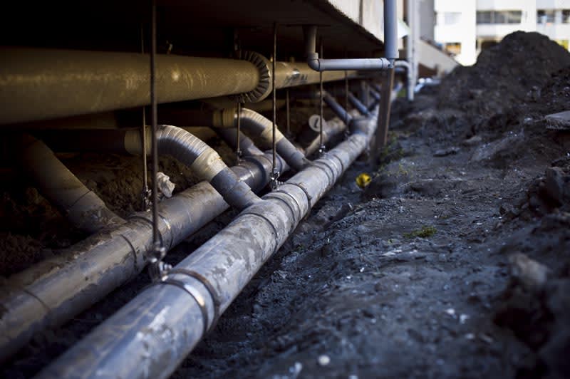 液状化による地盤沈下で下水管が剥き出し。